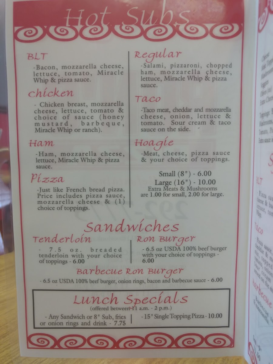 Additionally, Ron's offers a selection of sandwiches, including tenderloins and ham & cheese subs, catering to a variety of tastes. And don’t forget to wash your meal down with a refreshing drink from their extensive beverage list, which features everything from 16 Oz. draft beer to bottled water.